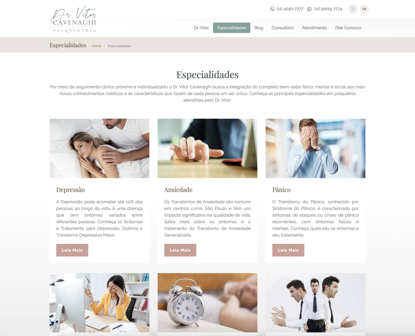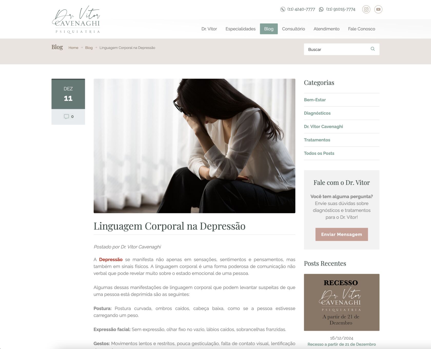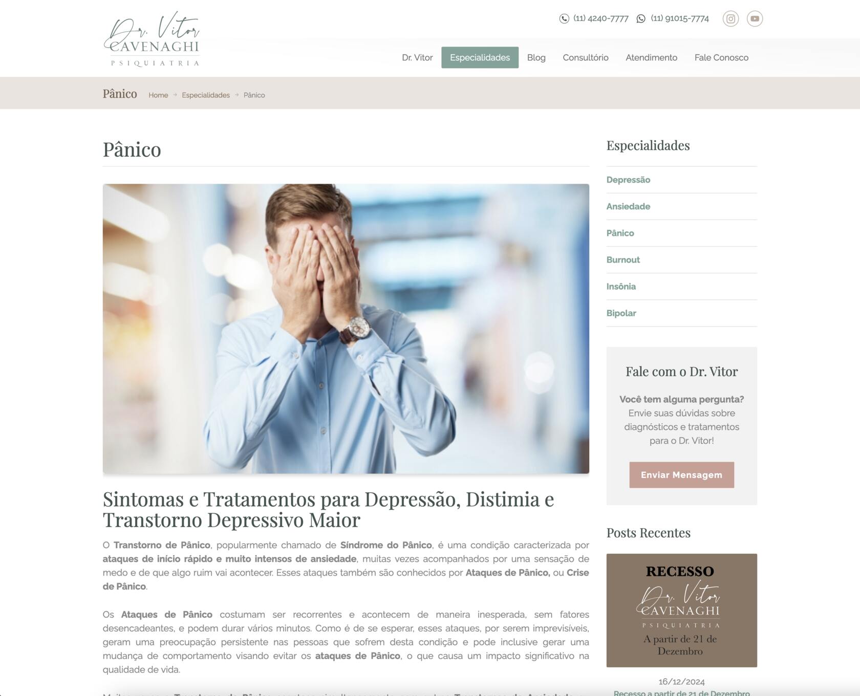 Além da parte visual e estrutural, também entregamos uma consultoria completa de SEO e definimos diretrizes para produção de conteúdo. Como resultado, o site do Dr. Vitor Cavenaghi tornou-se referência em visibilidade digital para a área da psiquiatria, alcançando a primeira página do Google para buscas como “psiquiatra especialista em depressão” e mantendo-se entre os líderes em presença orgânica na especialidade.