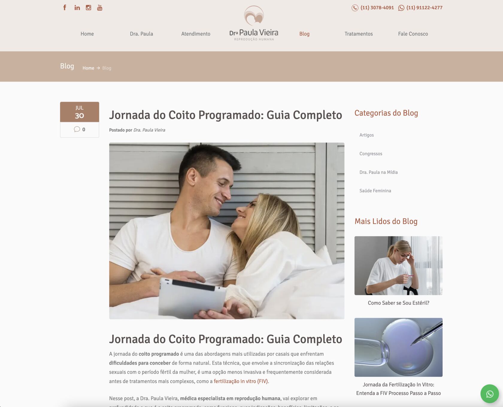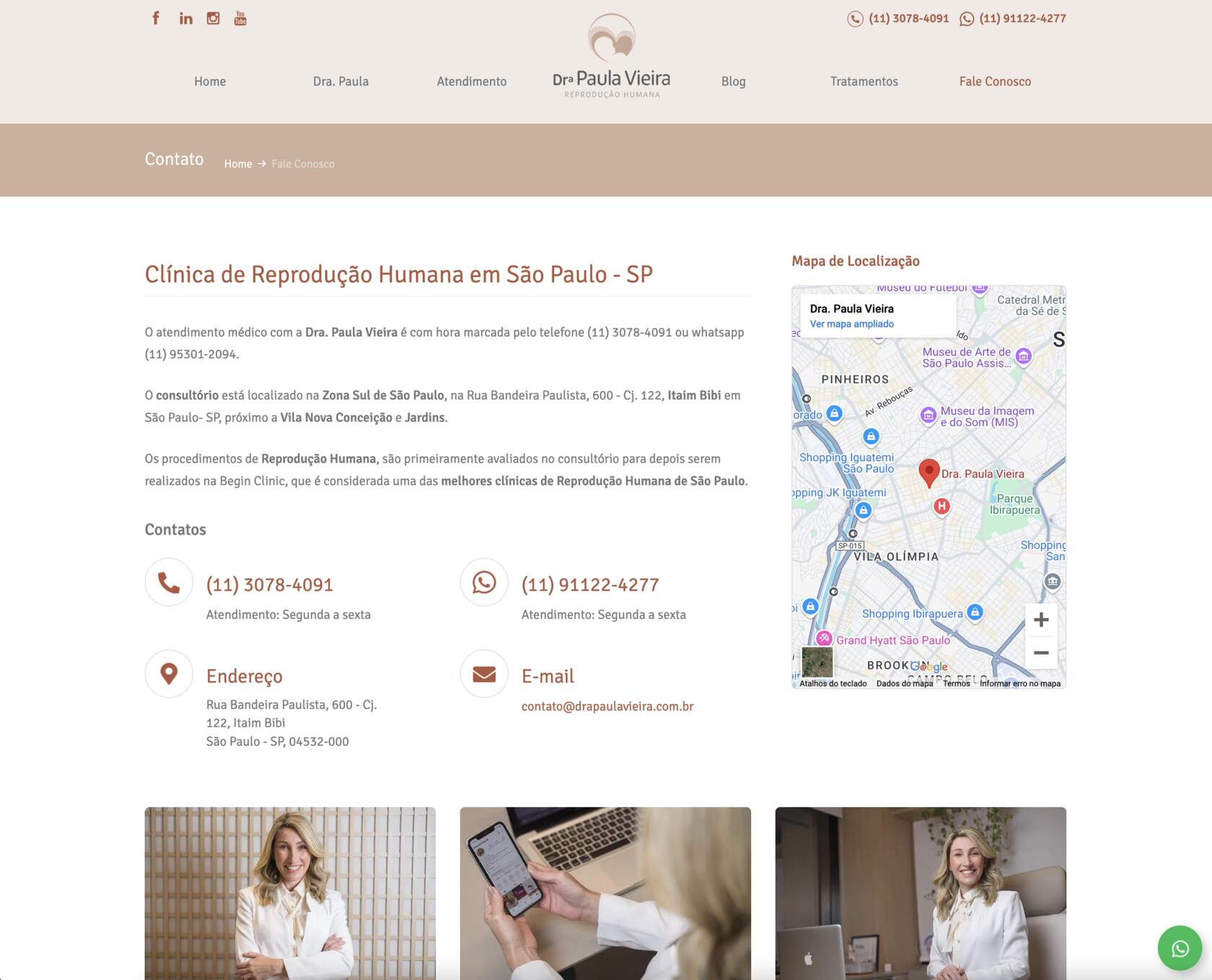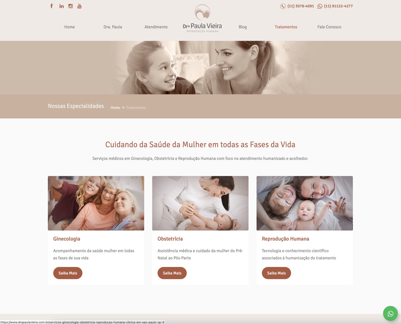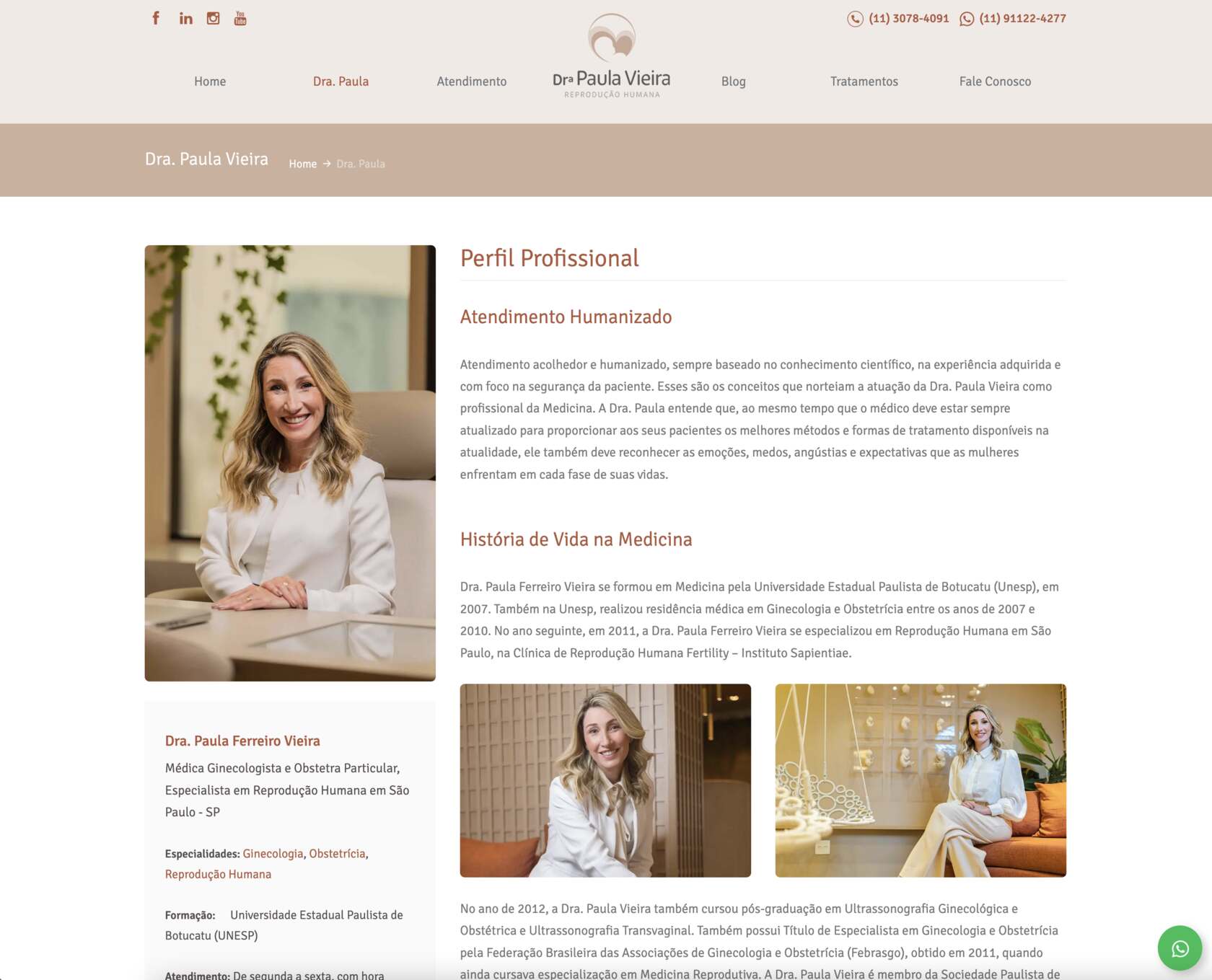 Inicialmente desenvolvemos um site moderno e responsivo com CMS integrado, que oferece autonomia para a Dra. Paula gerenciar seu Blog e acompanhar relatórios de marketing em tempo real. Além das páginas institucionais que apresentam o perfil da médica, as especialidades e o consultório, o site possui um sistema robusto de captação de leads (contatos de pacientes) e um acompanhamento eficiente de follow-up.