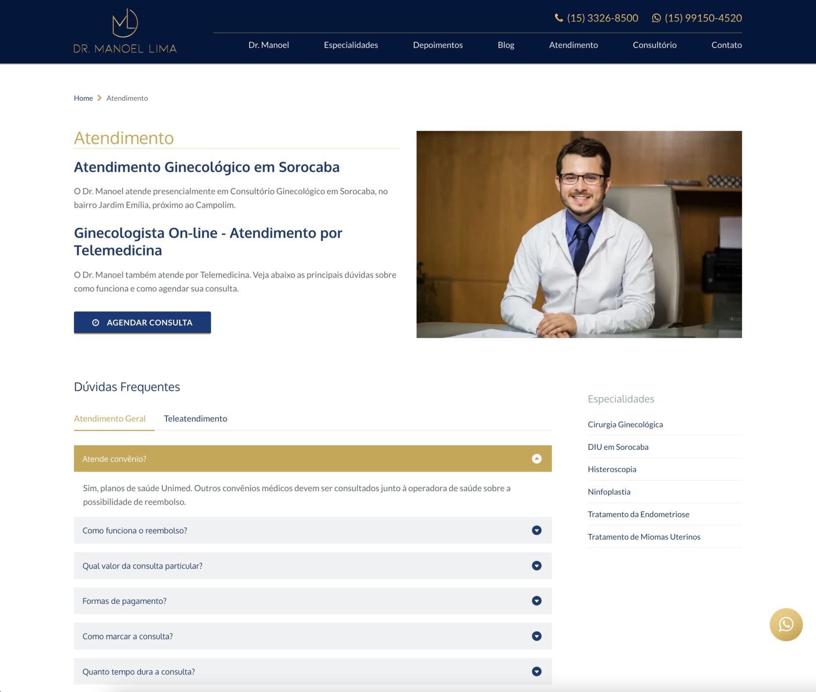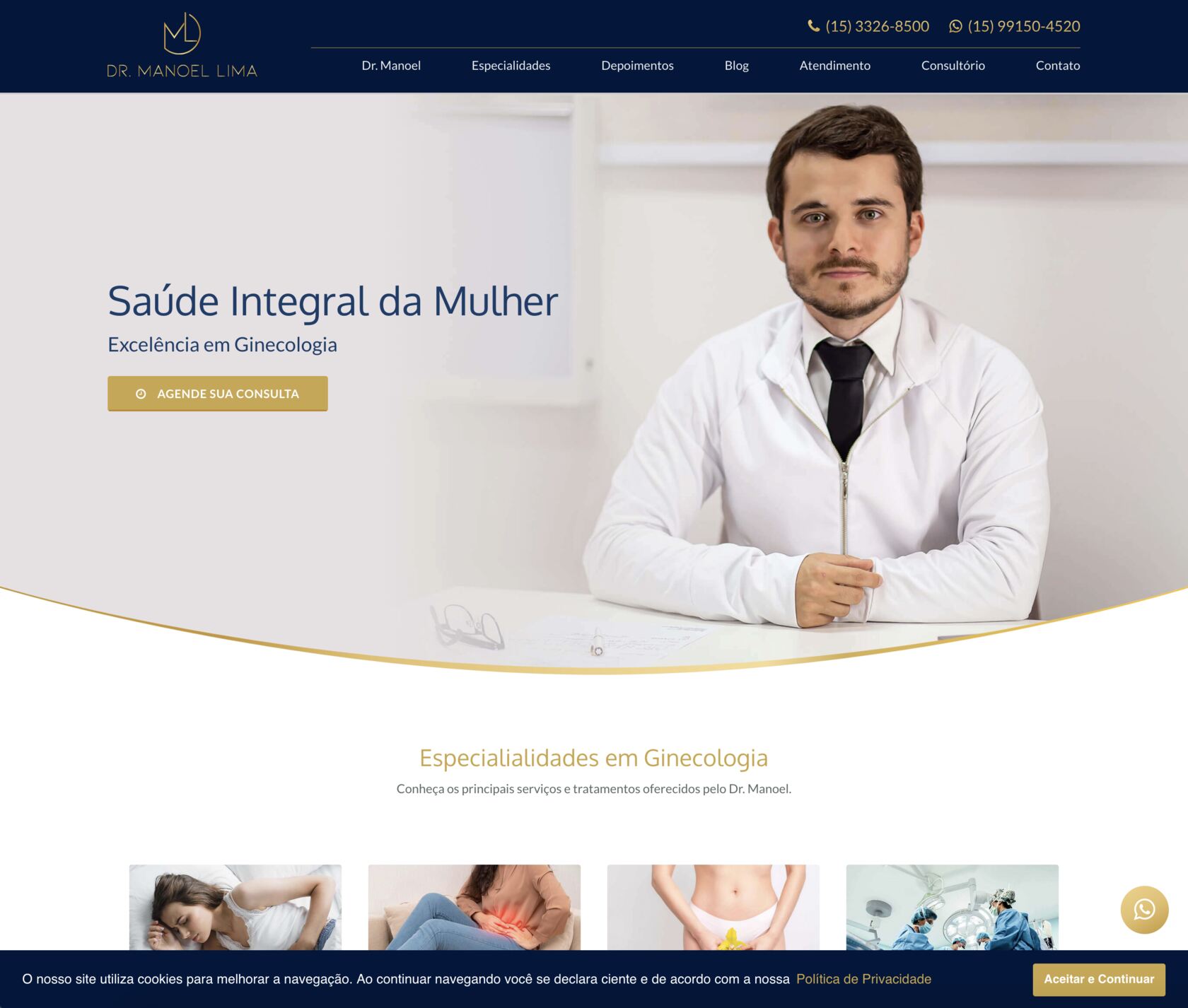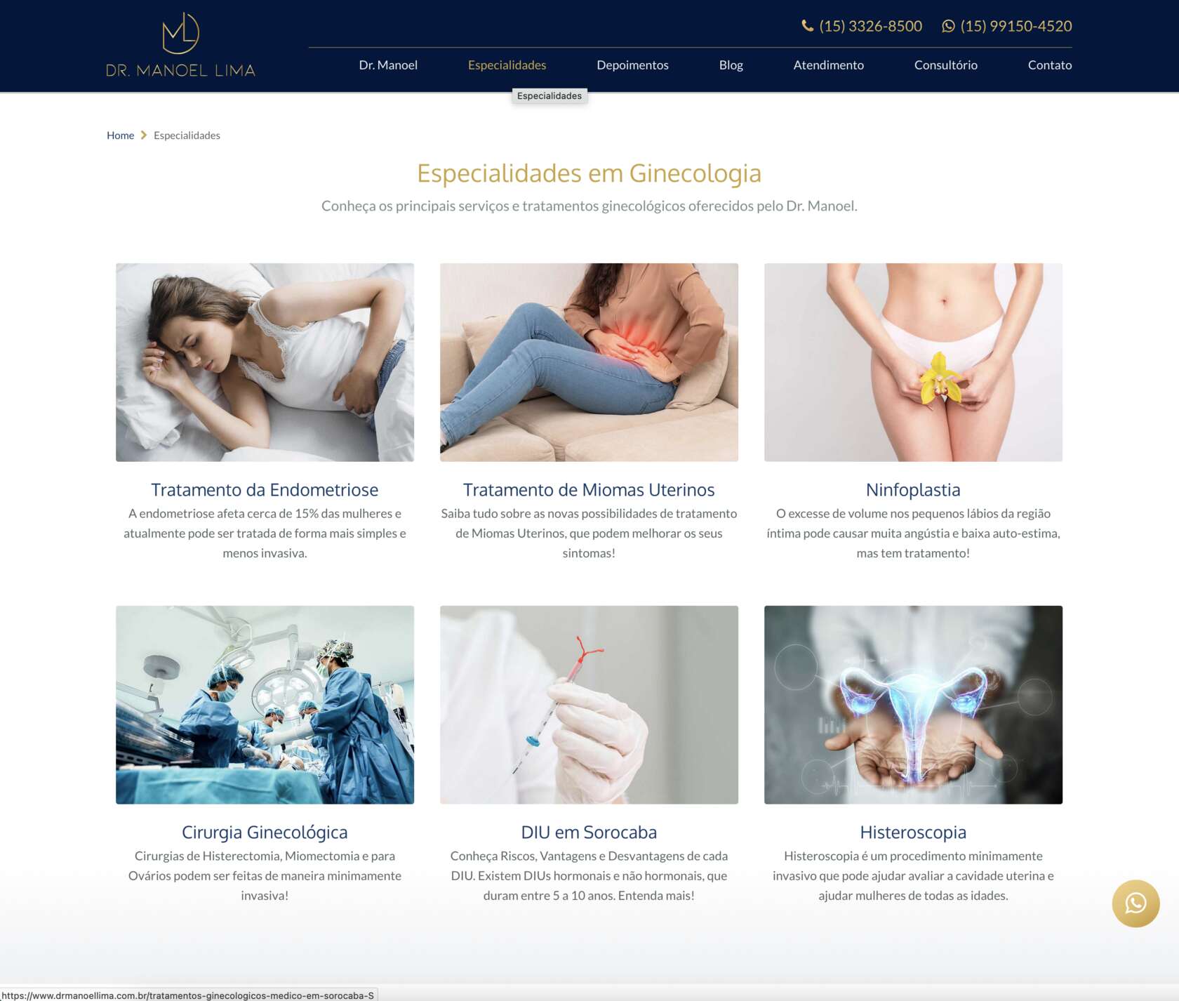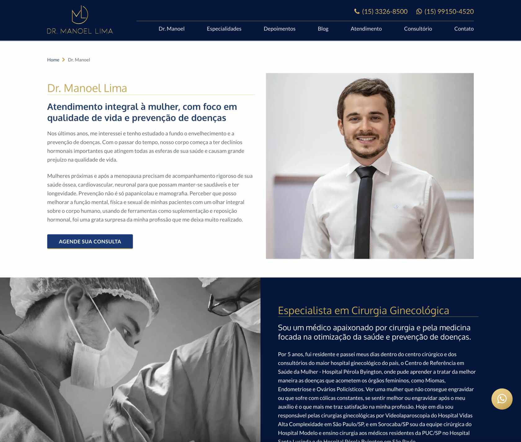 O site nasceu com uma arquitetura de informação sólida e conteúdo cuidadosamente trabalhado para refletir a autoridade e a proximidade que o Dr. Manoel desejava construir com suas pacientes. A página de perfil apresenta quem ele é com clareza e respeito à sua trajetória: um profissional comprometido, com expertise cirúrgica e um olhar atento ao bem-estar de cada mulher que atende. Em seguida, a seção de especialidades detalha os tratamentos oferecidos com linguagem acessível e informativa, permitindo que a paciente entenda exatamente como pode ser acolhida e acompanhada em seu cuidado íntimo.