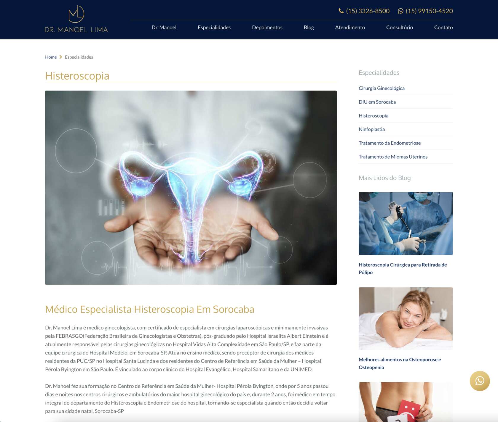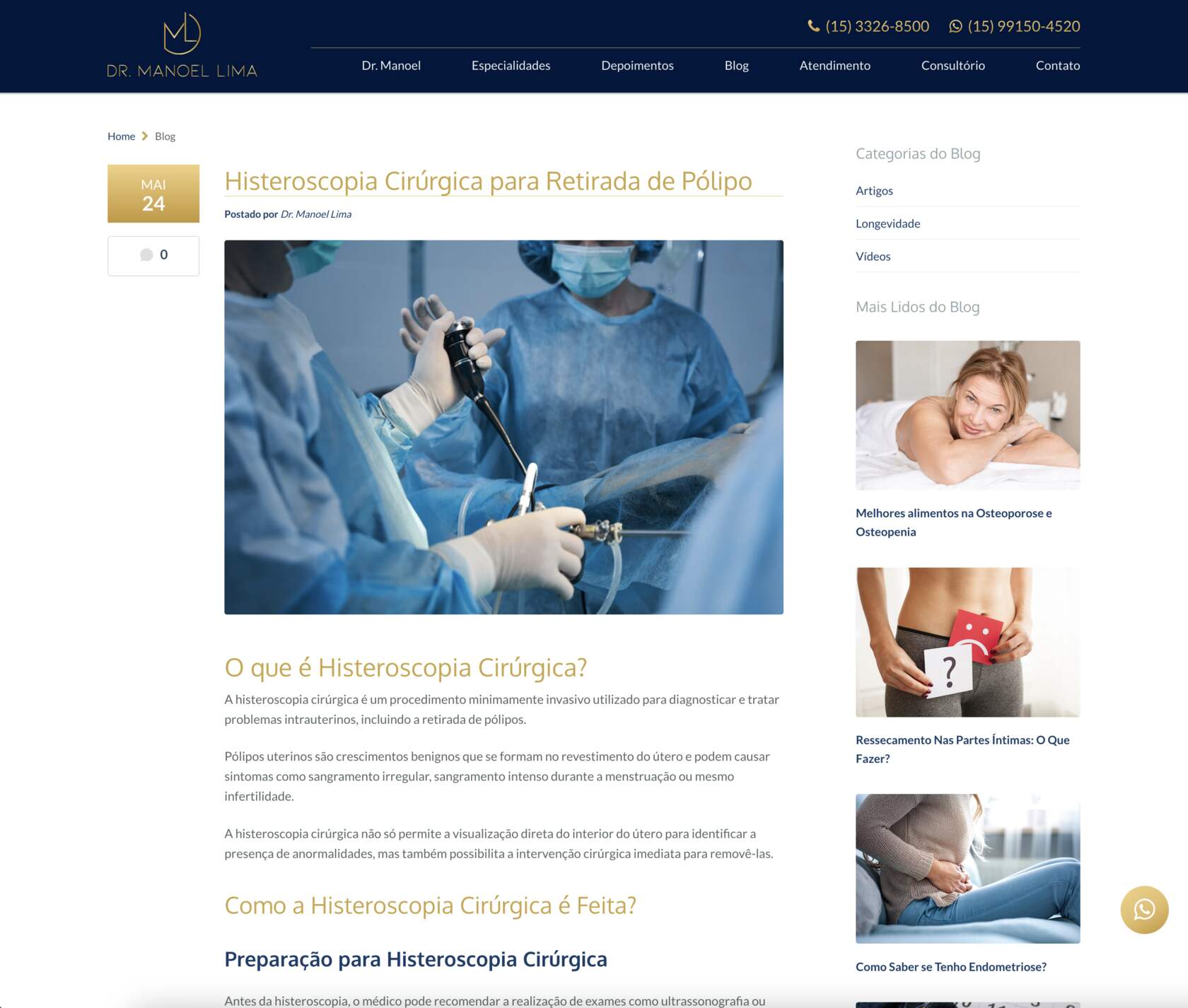 O projeto contou ainda com a criação de um blog totalmente integrado ao site, com CMS, permitindo que o próprio Dr. Manoel tenha autonomia para publicar conteúdos voltados à sua área de atuação. Essa ferramenta faz parte do que chamamos de “markerking de conteúdo” e trouxe mais do que visibilidade - trouxe aproximação. Porque quando um médico compartilha seu conhecimento de forma clara e consistente, ele também constrói um vínculo de confiança com quem o lê.