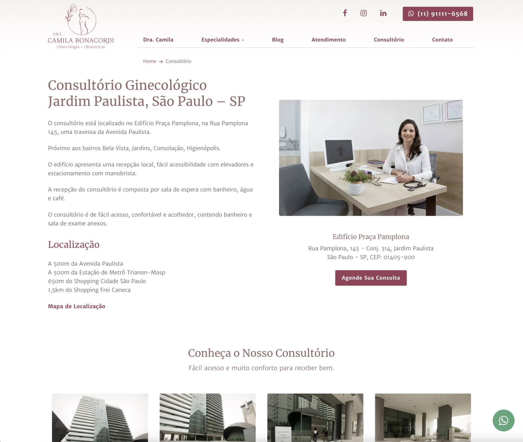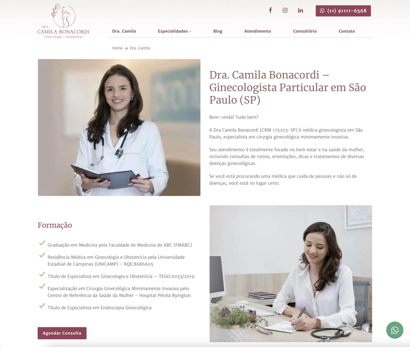 O site conta com páginas institucionais que apresentam o perfil profissional da Dra. Camila, a estrutura do consultório, informações detalhadas sobre o atendimento e as especialidades oferecidas. Além disso, há integração com redes sociais e canais de contato para facilitar a comunicação com as pacientes.