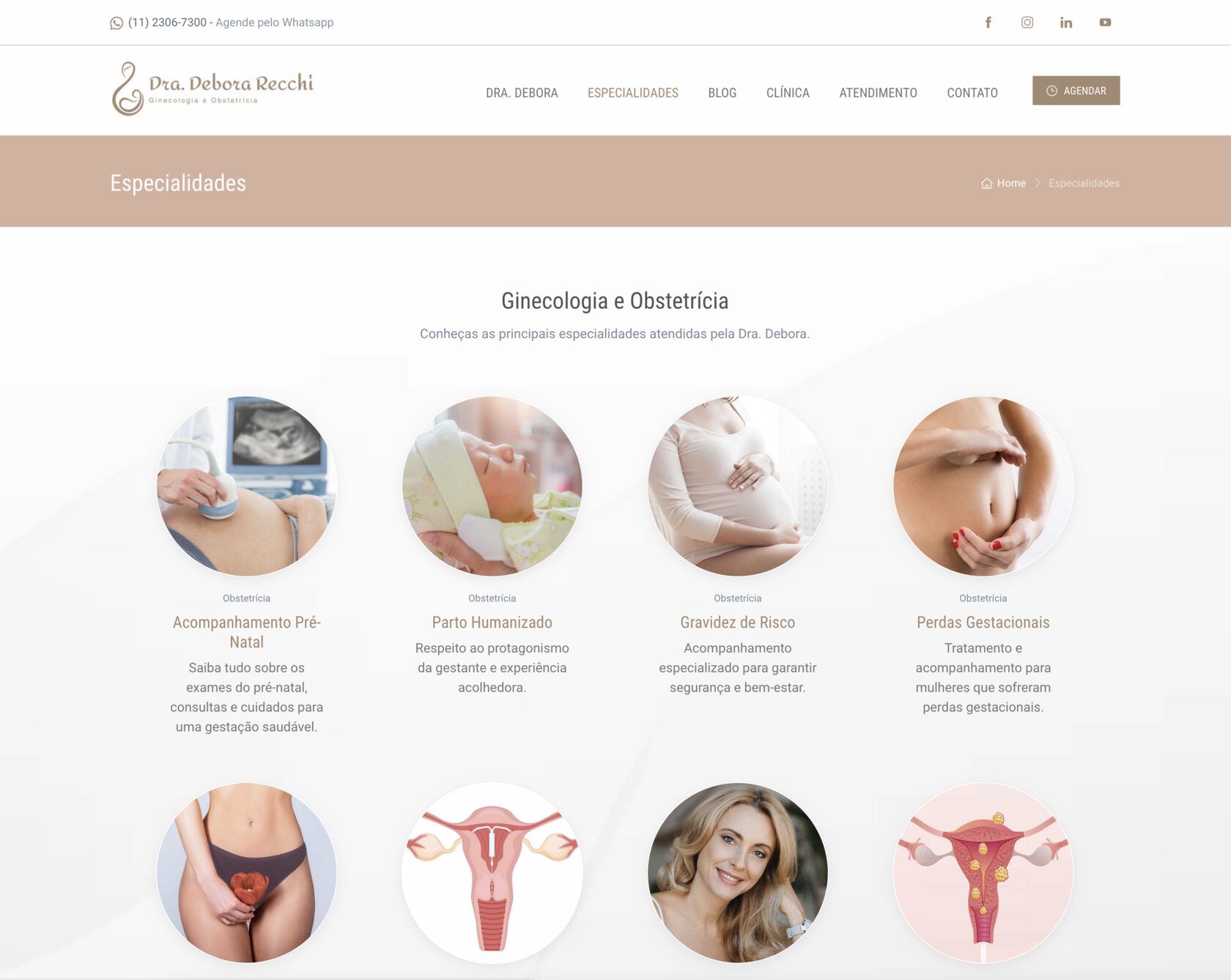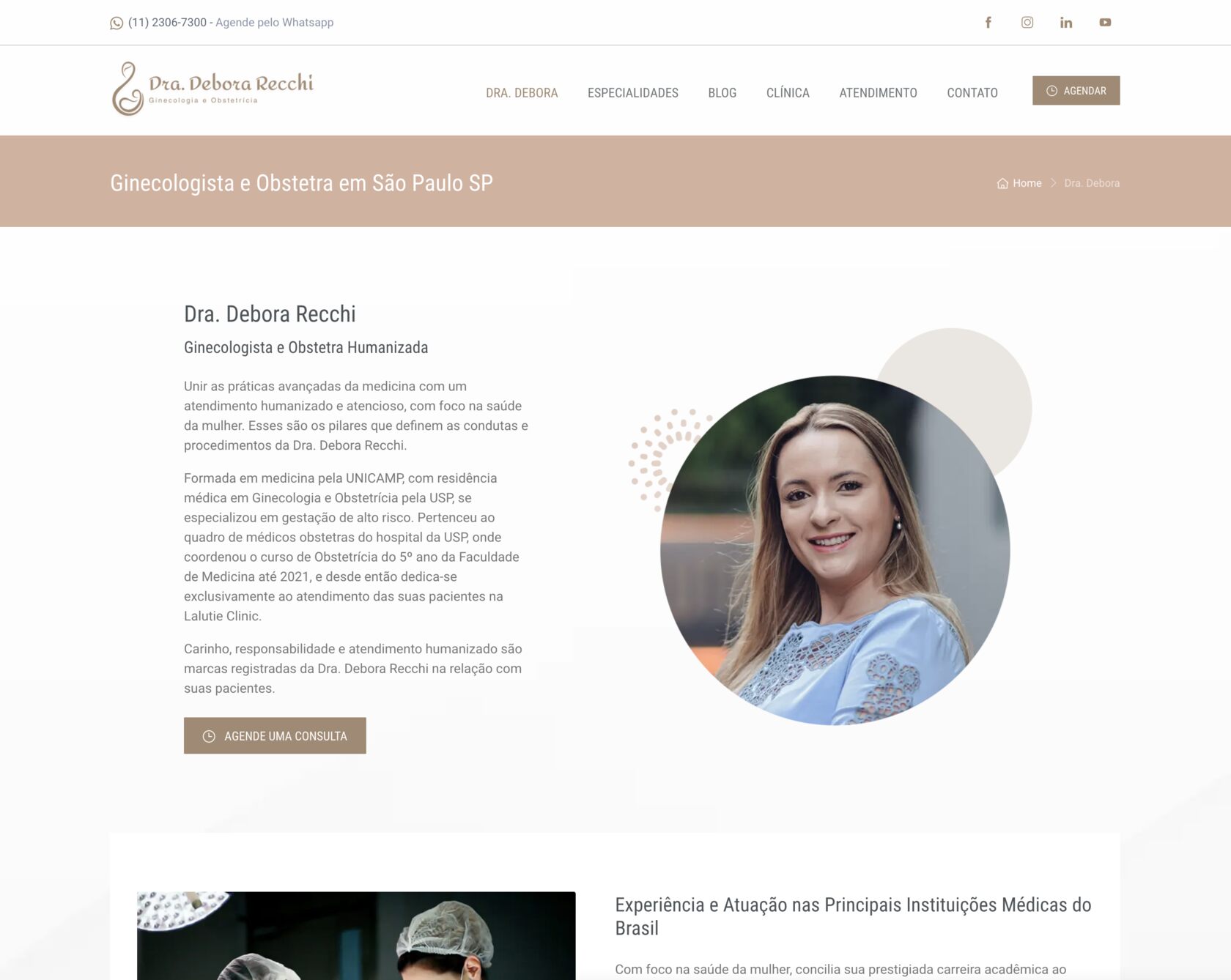 Com base nessa estrutura, desenhamos um site responsivo, funcional e leve, mas acima de tudo humano e alinhado à identidade visual de sua clínica: a Lalutie Clinic. A página de perfil foi cuidadosamente construída para apresentar quem é a Dra. Debora, com sua trajetória profissional, formações, diferenciais e áreas de atuação. Era importante mostrar a médica por trás do nome - a profissional comprometida com a saúde da mulher, com sua presença forte na obstetrícia e seu olhar sensível na ginecologia. Em seguida, estruturamos uma área exclusiva de especialidades, onde cada tratamento e abordagem é apresentado com clareza e empatia, respeitando a complexidade da jornada de cada paciente.