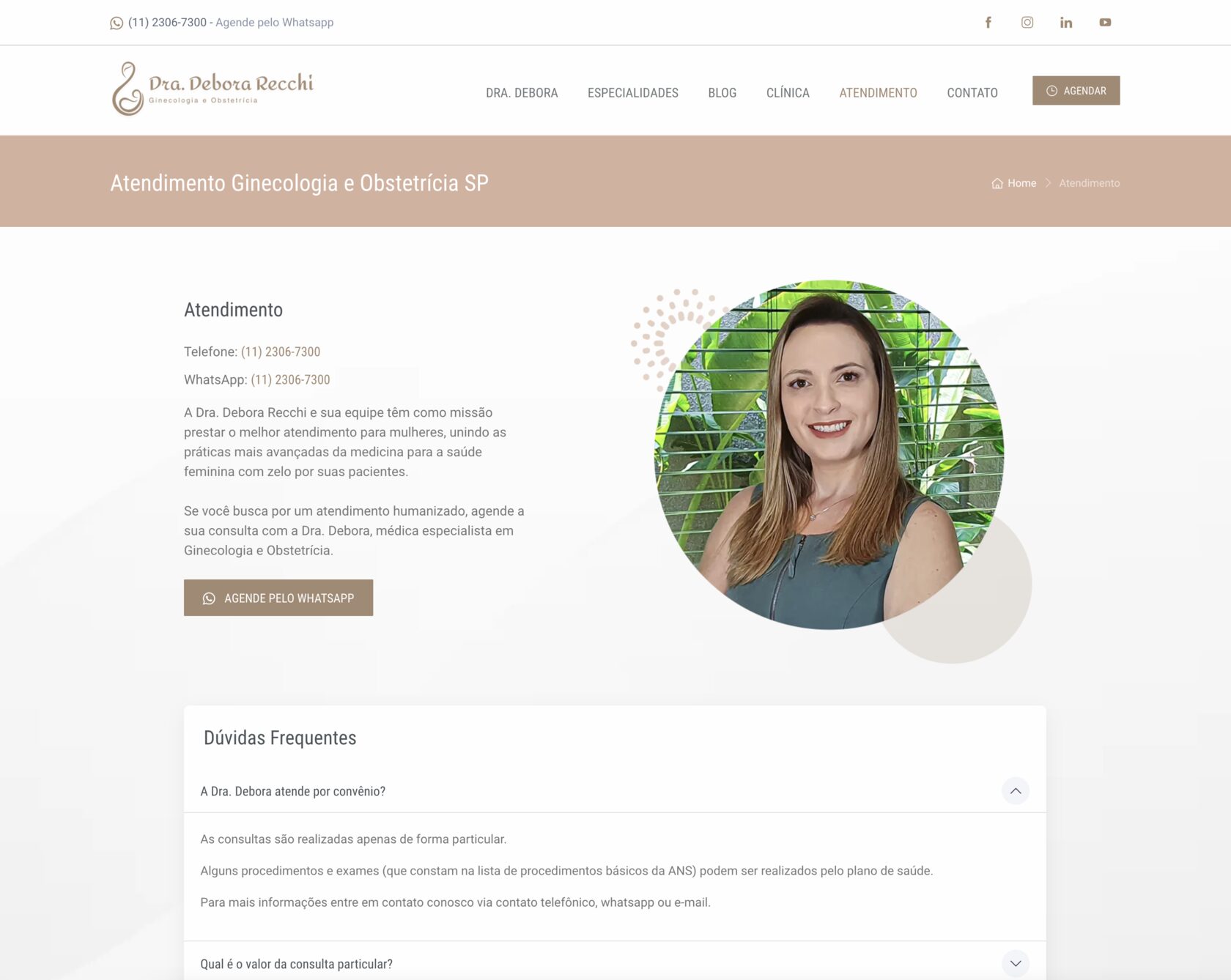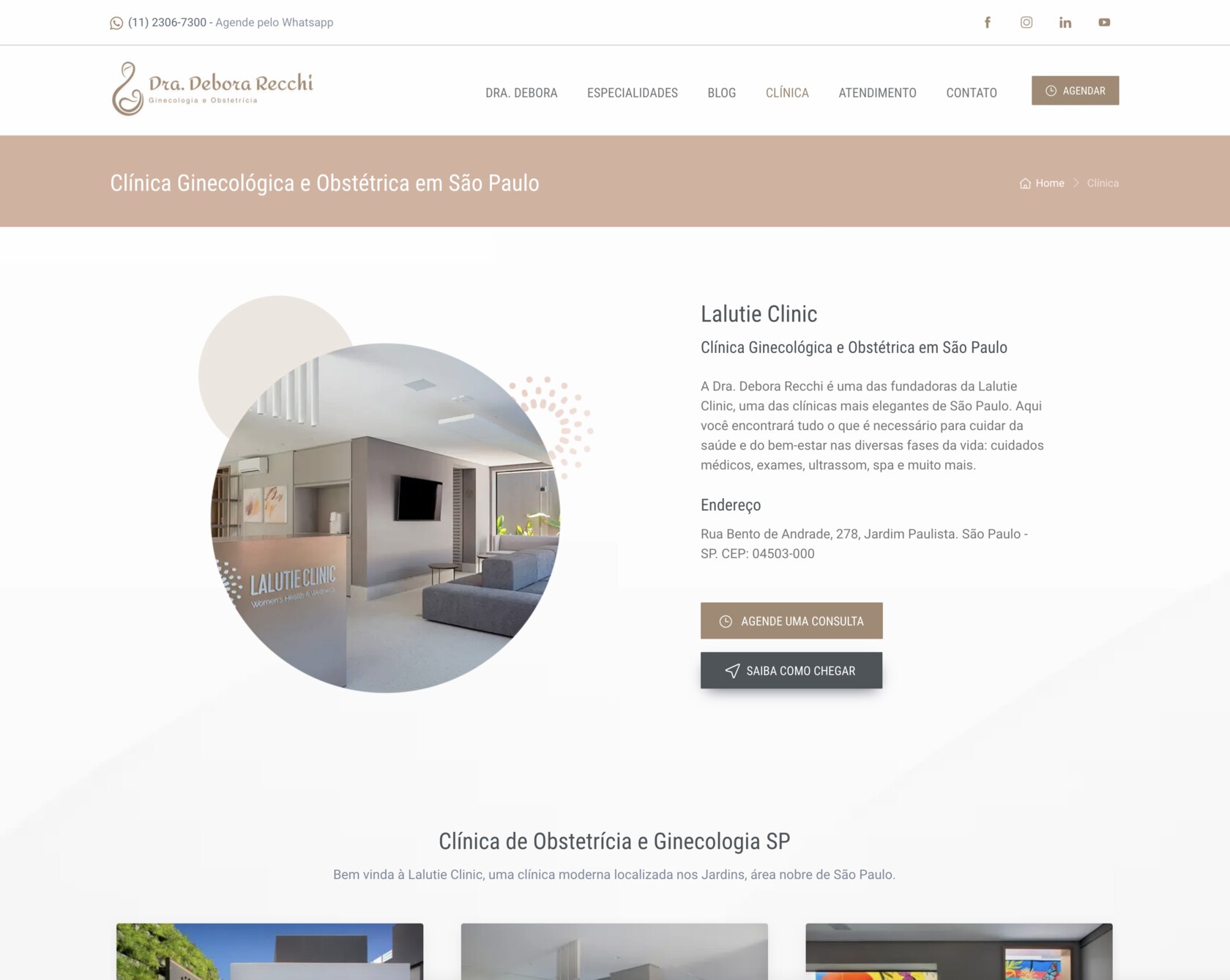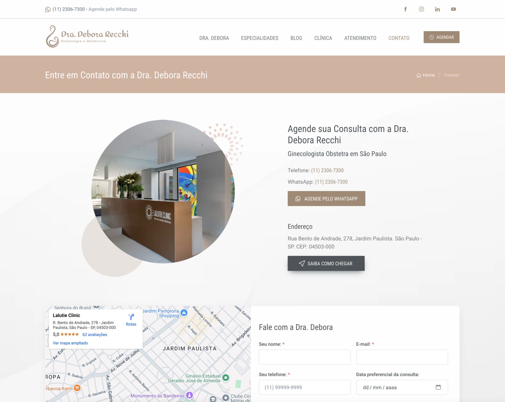 A página da clínica ganhou um espaço especial no novo site. Ali, mostramos não apenas a estrutura física do atendimento, mas também criamos uma experiência digital que espelha o acolhimento que a paciente encontrará presencialmente. A integração com o Google Maps facilita o acesso, enquanto a organização intuitiva do site permite que a navegação seja simples, confortável e fluida. Na página de atendimento, explicamos com transparência como funciona o trabalho da Dra. Debora, com informações importantes sobre convênios e formas de marcação de consultas. Já na área de contato, desenvolvemos um formulário para facilitar a comunicação direta com a equipe, permitindo que as pacientes enviem dúvidas, pedidos de agendamento ou mensagens com poucos cliques, de forma prática e segura.